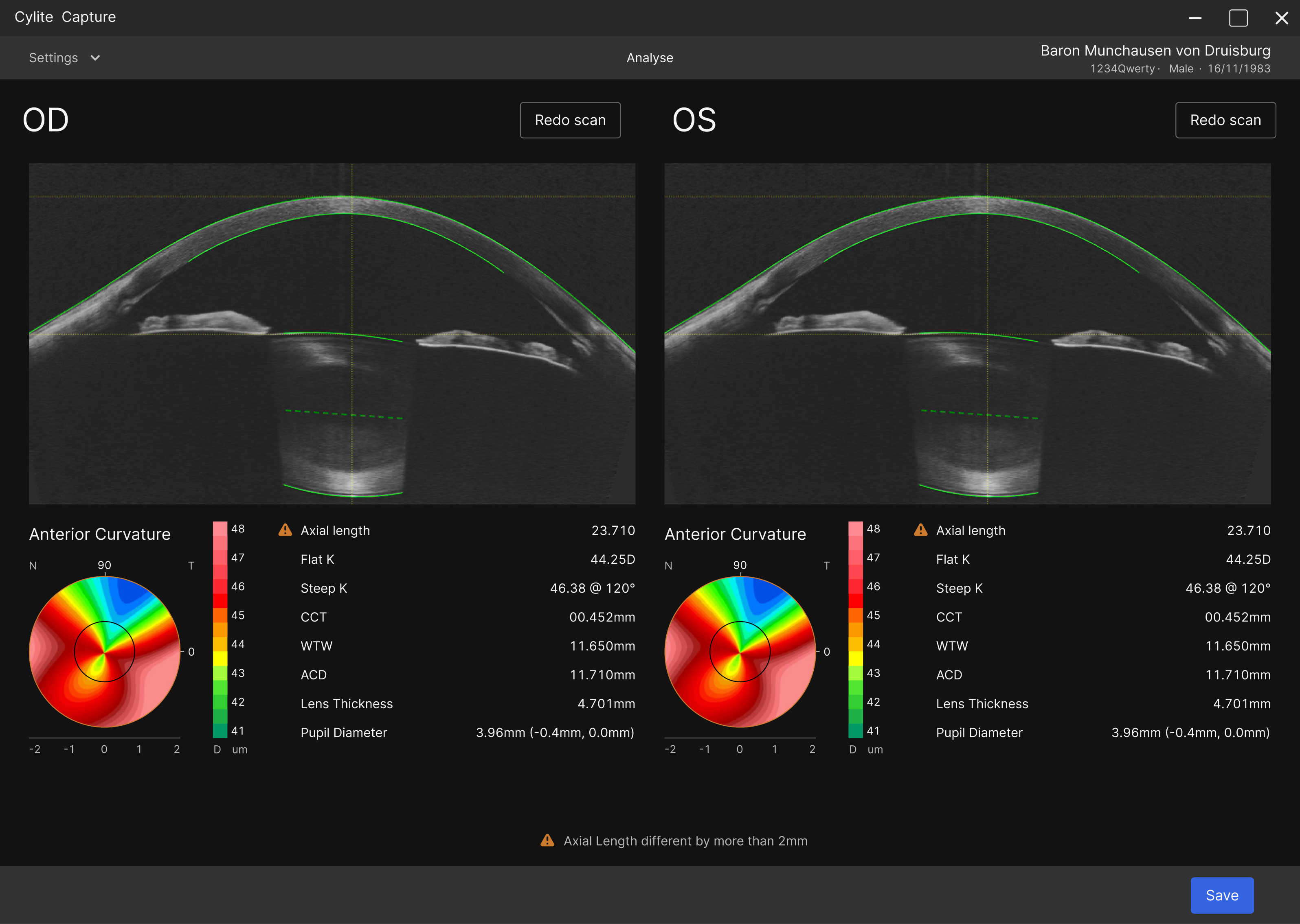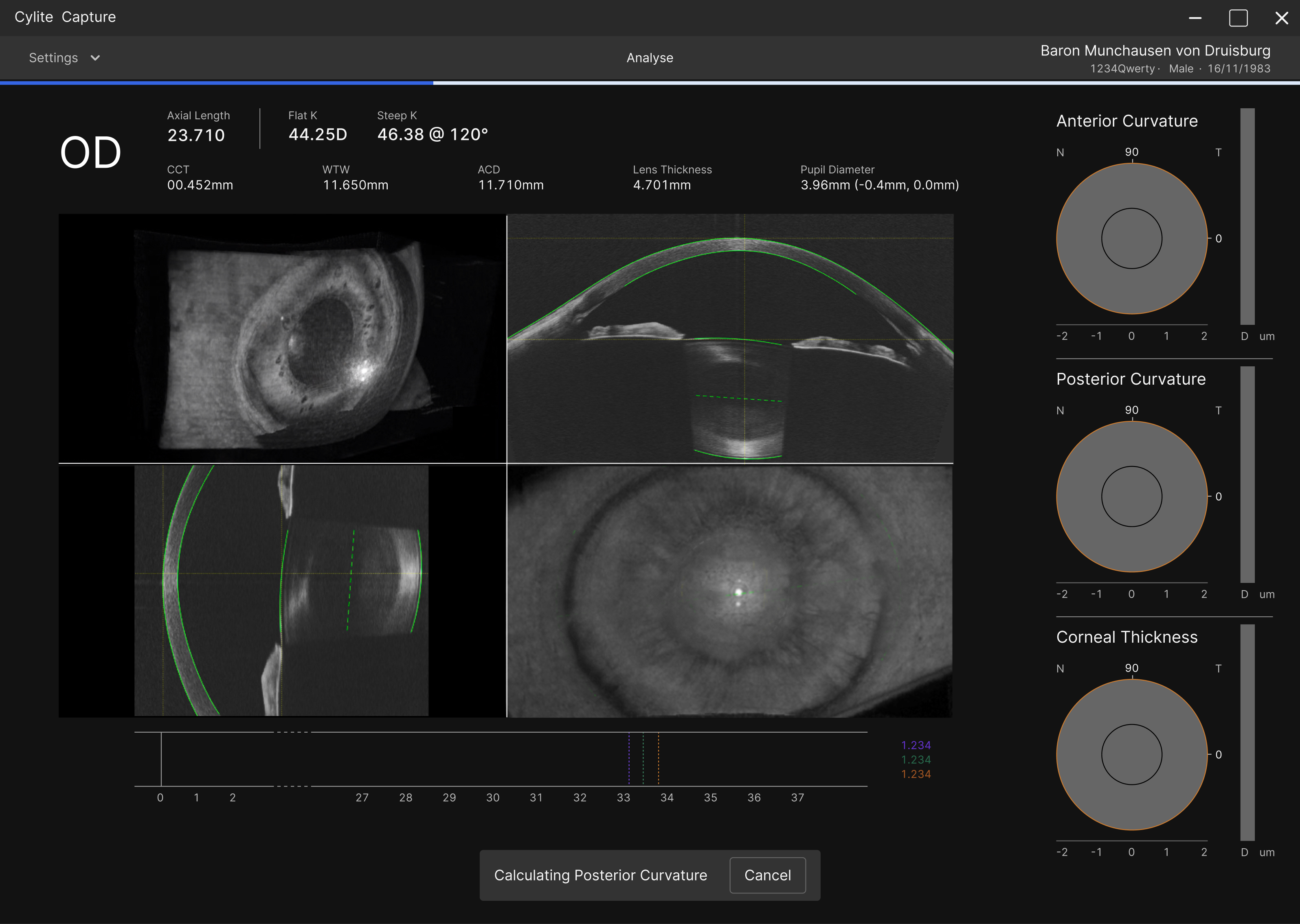 I designed the full software experience including a native Windows application for controlling the scanning device, and a web-based platform for exploring, analysing, and sharing the results. A design pattern language for exams, diagnostics, and admin tasks provided a unified experience across both applications. The platform entered real-world clinical use, with independent optometrists adopting the system internationally. Cylite was subsequently acquired by Alcon, one of the world's leading eyecare companies.