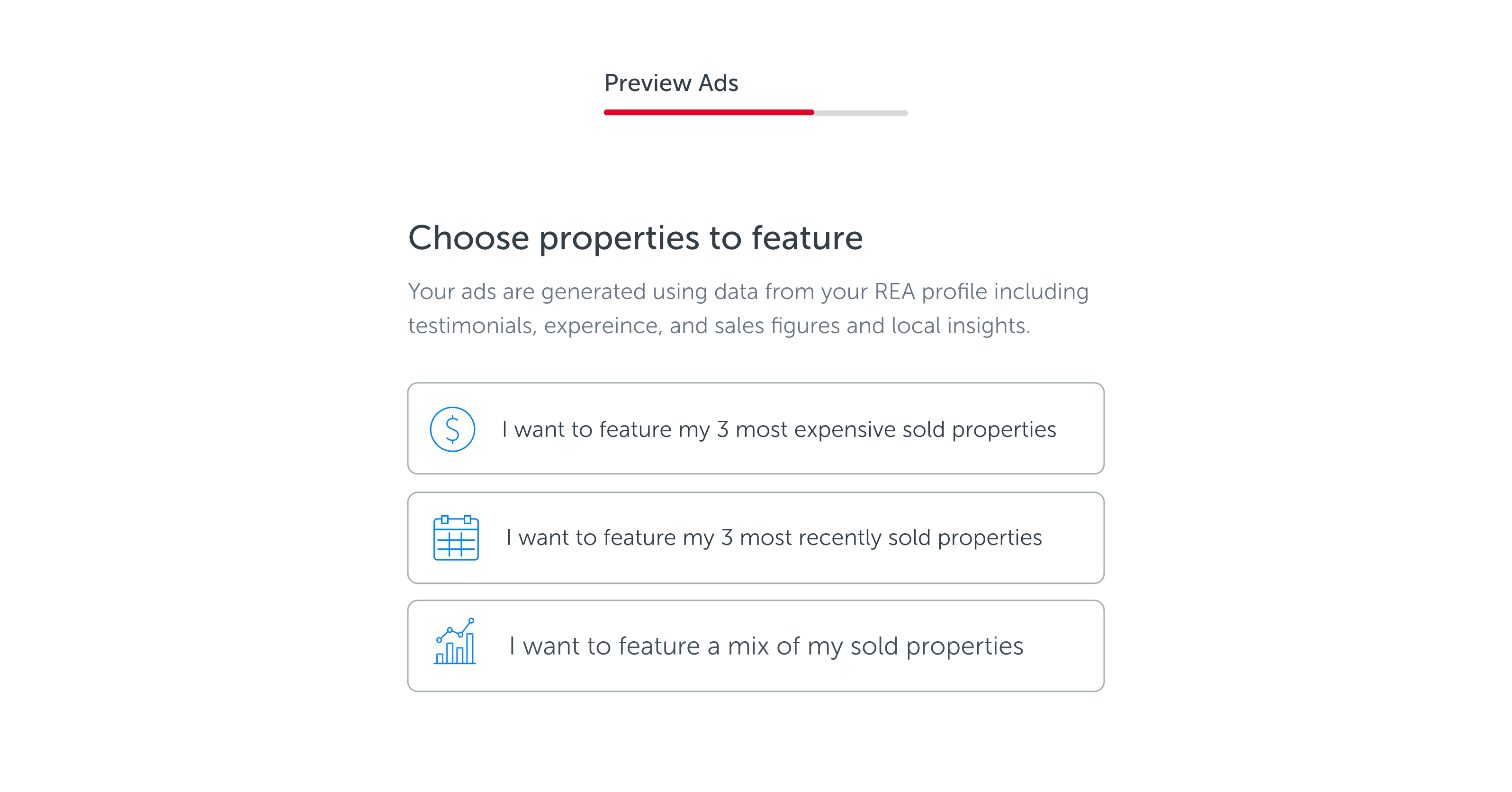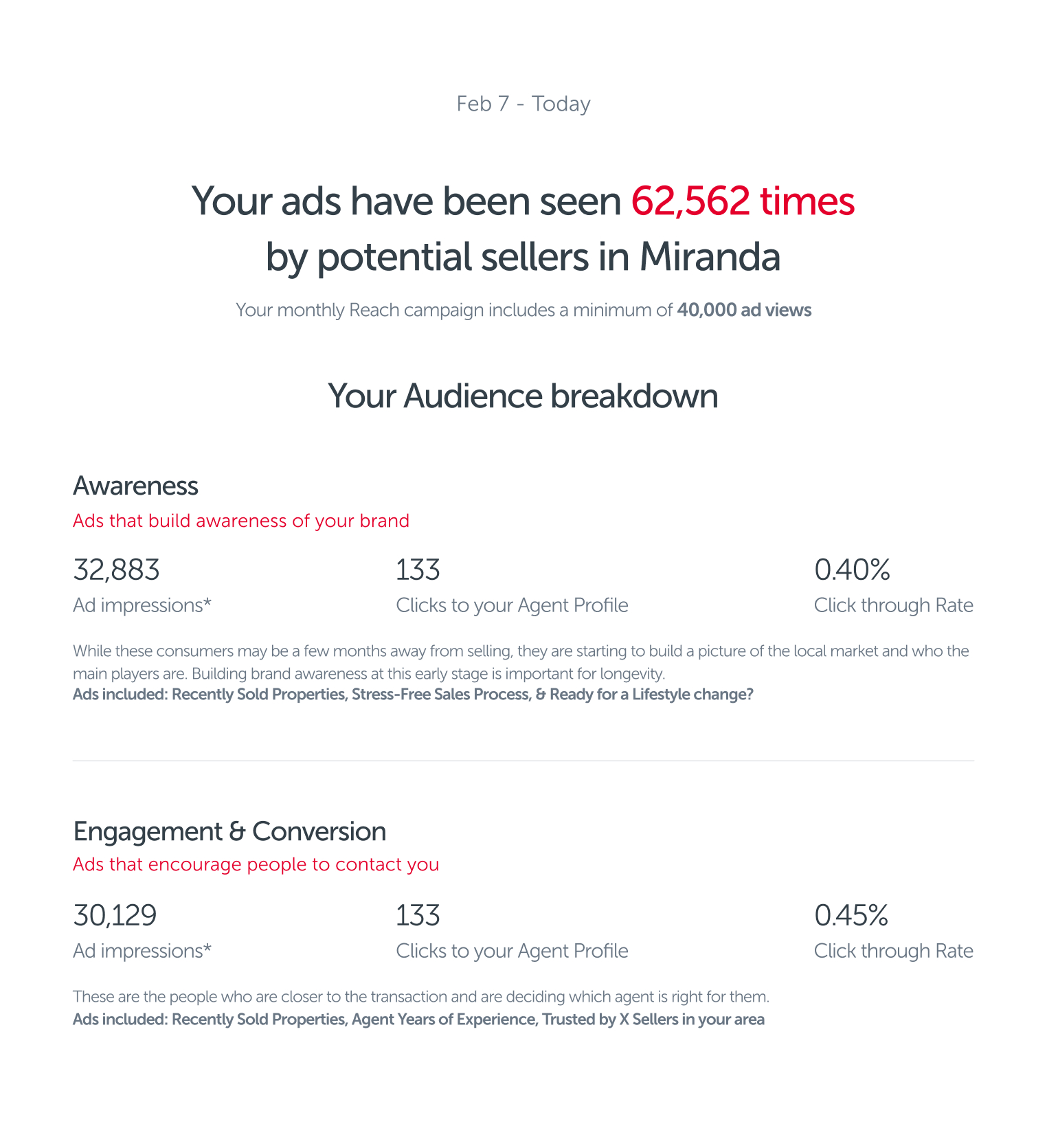 Within three months of starting, we were running a live product with real paying customers. Agent Reach was an experimental startup venture built inside REA Group to be deliberately fast and lean, while operating inside an enterprise with established ways of working. As the sole designer on a team of external consultants, I owned design end-to-end: from early concept and customer research to proving product-market fit and the shipped product experience. To get to market fast, the product manager and I ran a Wizard of Oz. We manually bought ads and generated reports while the product looked and felt automated to users. Integrating with existing systems meant working around technical debt and organisational dependencies that constantly pushed back against the startup pace we needed. Agent Reach became sustainably profitable and was subsequently integrated into REA's broader product suite, evolving into what is now Agent Edge and Audience Maximiser.