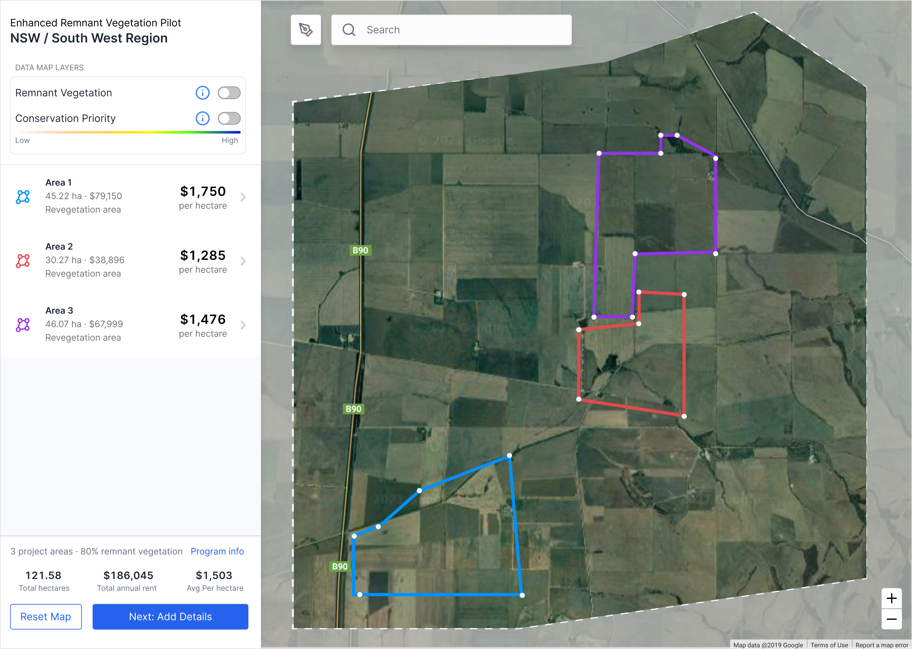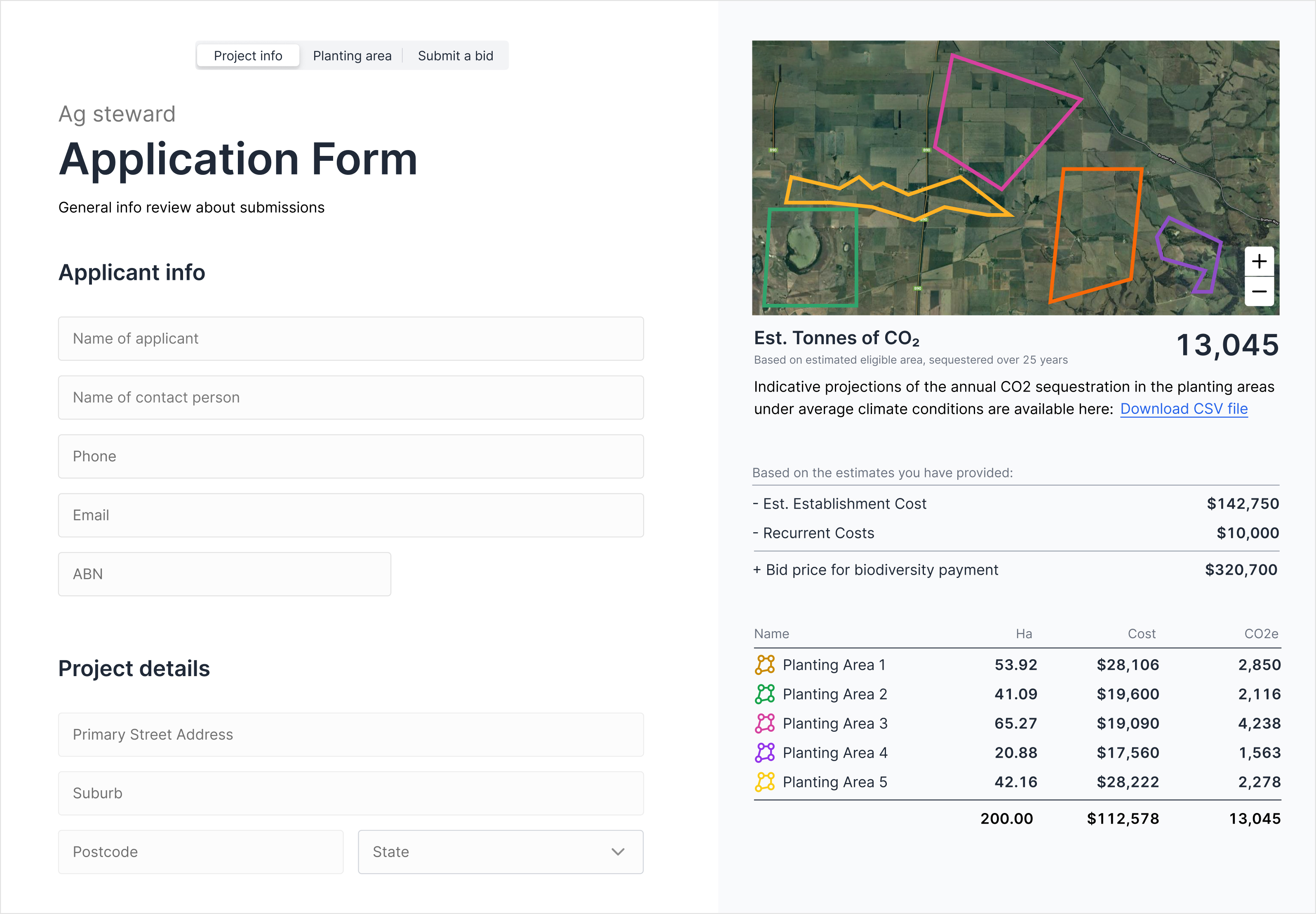 The National Stewardship Trading Platform was a single platform giving Australian landholders the tools to map their environmental assets, estimate project costs, and connect directly with buyers of nature repair outcomes. A six-week pilot generated over 700,000 tonnes worth of carbon abatement projects This result was compelling enough to secure additional government funding to expand the platform further.